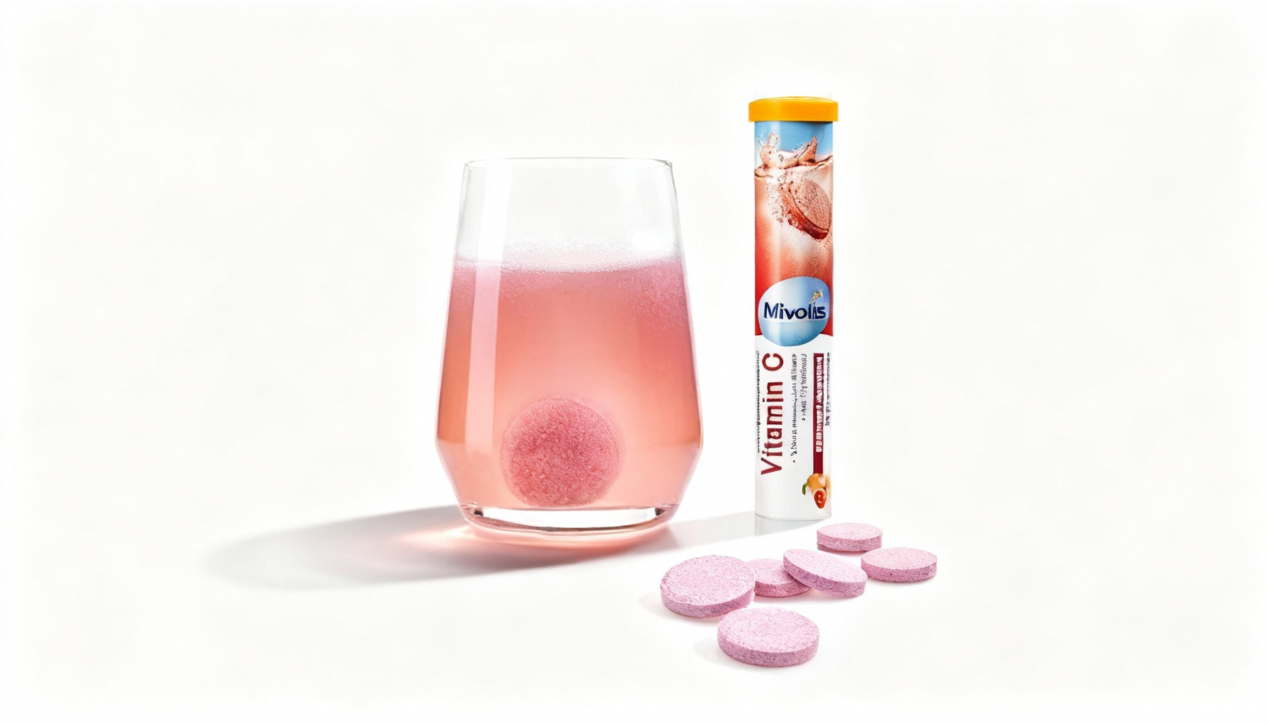 240 mg Vitamin C pro Tablette – ohne Zuckerzusatz – Blutorangen-Geschmack.